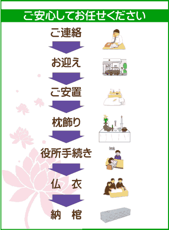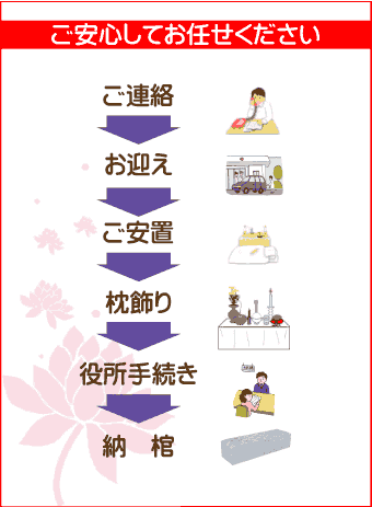 初めてのときは誰もがどうしてよいのか分からないもの。ご希望や予算など、葬儀プランナー有資格スタッフがお客様の身になってご相談をお聞きいたします。当社では、葬儀に対する不安をなくすために事前相談を無料で行っております。一番最初の段階からお手伝いいたします。お気軽にご遠慮なくご相談下さい。